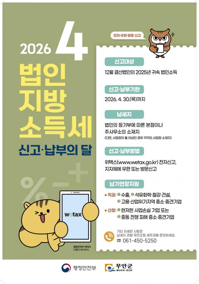 [È£³²´º½º¶óÀÎ = ¼ÀºÈ« ±âÀÚ] ¹«¾È±ºÀº ¹ýÀÎ ¼Òµæ¿¡ ´ëÇØ Áö¹æÀÚÄ¡´Üü¿¡ ³³ºÎÇÏ´Â ¹ýÀÎÁö¹æ¼Òµæ¼¼ ½Å°í¡¤³³ºÎ ±â°£À» ¸Â¾Æ ¿À´Â 4¿ù 30ÀϱîÁö ÁýÁ߽Űí±â°£À» ¿î¿µÇÑ´Ù°í ¹àÇû´Ù.