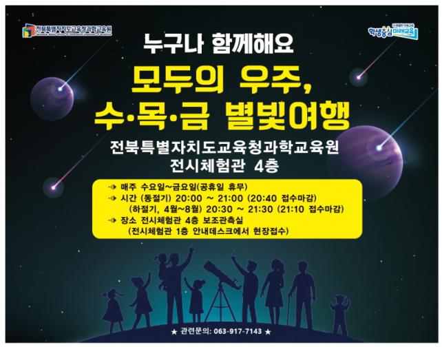 [È£³²´º½º¶óÀÎ = ¼ÀºÈ« ±âÀÚ] ÀüºÏƯº°ÀÚÄ¡µµ±³À°Ã»°úÇб³À°¿ø(¿øÀå °Áø¼ø, ÀÌÇÏ °úÇб³À°¿ø)Àº 4¿ù °úÇÐÀÇ ´Þ°ú º½À» ¸ÂÀÌÇØ µµ¹Îµé¿¡°Ô ¹ãÇÏ´ÃÀÇ ½Åºñ·Î¿òÀ» ¼±»çÇϰíÀÚ ¡®º½Ã¶ º°ÀÚ¸®¿Í ÇÔ²²ÇÏ´Â ¼ö¡¤¸ñ¡¤±Ý º°ºû¿©Ç࡯À» ¿î¿µÇÑ´Ù.