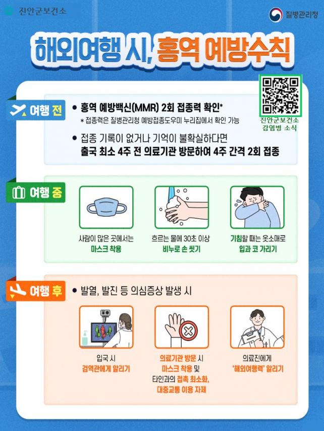 ƯÈ÷ ÃÖ±Ù µ¿³²¾Æ½Ã¾Æ, À¯·´, Áßµ¿ µî ÀϺΠ±¹°¡¿¡¼ È«¿ª ¹ß»ýÀÌ Áõ°¡Çϰí ÀÖ¾î ÇØ¿Ü¿©Çà Àü MMR(È«¿ª¡¤À¯Ç༺ÀÌÇϼ±¿°¡¤Ç³Áø) ¿¹¹æÁ¢Á¾ 2ȸ ¿Ï·á ¿©ºÎ¸¦ È®ÀÎÇØ¾ßÇÑ´Ù. Á¢Á¾ ¿©ºÎ°¡ ºÒÈ®½ÇÇÑ °æ¿ì Ãâ±¹ ÃÖ¼Ò 4ÁÖ Àü ÀÇ·á±â°ü »ó´ãÀ» ÅëÇÑ ¿¹¹æÁ¢Á¾À» ±Ç°í(4ÁÖ °£°Ý 2ȸ Á¢Á¾)ÇÑ´Ù.