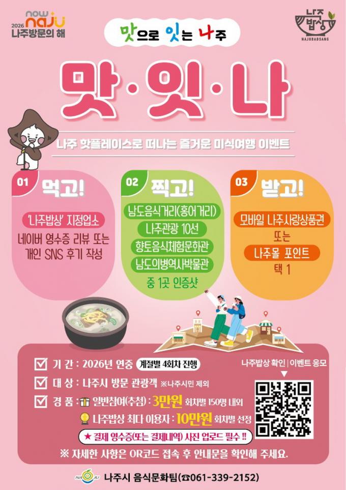 [È£³²´º½º¶óÀÎ = ¼ÀºÈ« ±âÀÚ] ³ªÁֽð¡ ¡®2026 ³ªÁֹ湮ÀÇ ÇØ¡¯¸¦ ¸Â¾Æ ½Ã ´ëÇ¥ À½½Ä ºê·£µåÀÎ ¡®³ªÁÖ¹ä»ó¡¯À» ¾Õ¼¼¿î »ç°èÀý ¹Ì½Ä À̺¥Æ® ¡®¸ÀÀ¸·Î ÀÕ´Â ³ªÁÖ, ¡®¸ÀÀÕ³ª¡¯ÀÇ 2ȸÂ÷(º½) ¿î¿µÀ» º»°ÝÀûÀ¸·Î ½ÃÀÛÇÑ´Ù.
