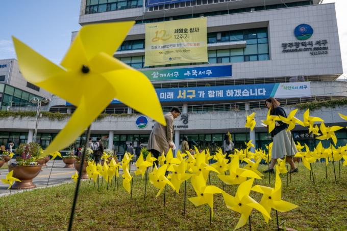 [È£³²´º½º¶óÀÎ = ¼ÀºÈ« ±âÀÚ] ±¤Áֽà ¼±¸´Â 13ÀÏ ¼¼¿ùÈ£ Âü»ç 12Áֱ⸦ ¸Â¾Æ ¼±¸Ã» ±¤Àå¿¡ Èñ»ýÀÚµéÀ» Ã߸ðÇÏ´Â ³ë¶õ ¹Ù¶÷°³ºñ 304°³¸¦ ¼³Ä¡Çß´Ù.