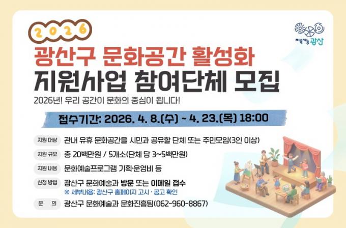 ±¤»ê±¸´Â 23ÀϱîÁö »ç¾÷¿¡ µ¿ÂüÇÒ ´Üü¸¦ ¸ðÁýÇÑ´Ù. ±¤»ê±¸¿¡ ¹®È°ø°£À» º¸À¯(¿î¿µ)Çϰí Àְųª »ç¿ë Çã°¡ µîÀ» ¹Þ¾Æ Áö¿ª»çȸ¿Í °ø°£À» °øÀ¯ÇÒ ÀÇÁö°¡ ÀÖ´Â ¹Î°£´Üü, 3ÀÎ ÀÌ»ó ÁֹΠ¸ðÀÓÀÌ ½ÅûÇÒ ¼ö ÀÖ´Ù.