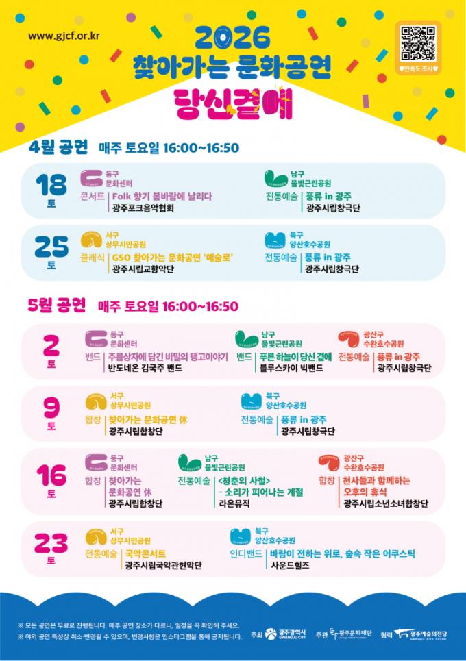 ¿ÃÇØ ù ¸·À» ¿Ã¸®´Â 4¿ù18ÀÏ °ø¿¬Àº µ¿±¸¿Í ³²±¸¿¡¼ °¢°¢ ÁøÇàµÈ´Ù. µ¿±¸¹®È¼¾ÅÍ¿¡¼´Â ±¤ÁÖÆ÷Å©À½¾ÇÇùȸÀÇ ¡®ÄܼƮ–Æ÷Å©(Folk), Çâ±â º½¹Ù¶÷¿¡ ³¯¸®´Ù¡¯ ¹êµå °ø¿¬ÀÌ, ³²±¸ ¹°ºû±Ù¸°°ø¿ø¿¡¼´Â ±¤Áֽø³Ã¢±Ø´ÜÀÇ ¡®Ç³·ù ÀÎ(in) ±¤ÁÖ¡¯ ÀüÅ뿹¼ú °ø¿¬ÀÌ ¹«´ë¿¡ ¿À¸¥´Ù.
