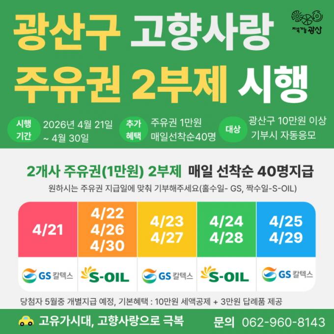 ÁÖÀ¯±Ç 2ºÎÁ¦ Çà»ç´Â ±¤»ê±¸¿¡ 10¸¸ ¿ø ÀÌ»ó ±âºÎÇÑ ±âºÎÀÚ¸¦ ´ë»óÀ¸·Î ¸ÅÀÏ 40¸í¿¡°Ô ¼±Âø¼øÀ¸·Î ÁÖÀ¯±Ç 1¸¸ ¿øÀ» Áö±ÞÇÑ´Ù. ±âºÎ ³¯Â¥¿¡ µû¶ó Ȧ¼öÀÏ¿¡´Â GSĮŨ½º, ¦¼öÀÏ¿¡´Â S-OIL ÁÖÀ¯±ÇÀ» Áö±ÞÇÒ ¿¹Á¤ÀÌ´Ù.