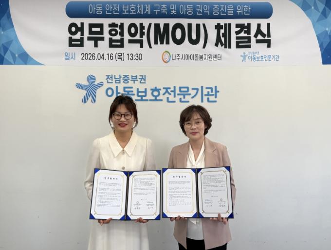 (»çÁøÁ¦°ø=Àü³²ÁߺαǾƵ¿º¸È£Àü¹®±â°ü)Àü³²ÁߺαǾƵ¿º¸È£Àü¹®±â°ü(°üÀå ±è¼ö°æ)Àº ³ªÁֽà ¾ÆÀ̵¹º½Áö¿ø¼¾ÅÍ(¼¾ÅÍÀå ±è¼³È)¿Í Áö³ 16ÀÏ(¸ñ), ³ªÁֽà Áö¿ª ¾Æµ¿ÀÇ ¾ÈÀüÇÑ º¸È£Ã¼°è ±¸Ãà°ú Áö¿ª»çȸ º¸È£¸Á °È¸¦ À§ÇÑ ¾÷¹«Çù¾à(MOU)À» ü°áÇß´Ù°í 21ÀÏ(È), ¹àÇû´Ù. »çÁøÀº ³ªÁֽþÆÀ̵¹º½Áö¿ø¼¾ÅÍ¿Í Çù¾à½ÄÀ» ÁøÇàÇÏ´Â ¸ð½À.