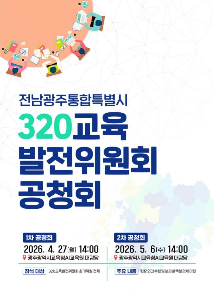 ½Ã±³À°Ã»Àº ¿À´Â 27Àϰú 5¿ù 6ÀÏ ±¤ÁÖAI±³À°¿ø¿¡¼ ±¤ÁÖ・Àü³² ±³À°ÇàÁ¤ ÅëÇÕ ´ëºñ ½Ãµµ¹Î Àǰ߼ö·ÅÀ» À§ÇÑ ¡®Àü³²±¤ÁÖÅëÇÕÆ¯º°½Ã 320±³À°¹ßÀüÀ§¿øÈ¸¡¯(ÀÌÇÏ 320À§¿øÈ¸) °øÃ»È¸¸¦ °³ÃÖÇÑ´Ù.