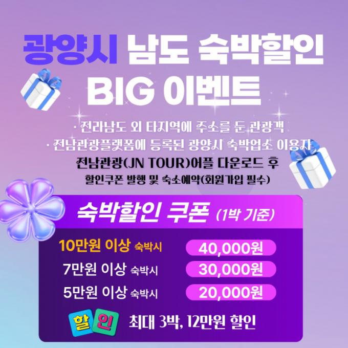 ¡®³²µµ ¼÷¹ÚÇÒÀÎ BIG À̺¥Æ®¡¯´Â Àü³²¡¤±¤ÁÖ ¿Ü Áö¿ª °ü±¤°´À» ´ë»óÀ¸·Î Àü³²Áö¿ª ¼÷¹Ú¾÷¼Ò ÀÌ¿ë ½Ã ÇÒÀÎ ÇýÅÃÀ» Á¦°øÇÏ´Â »ç¾÷ÀÌ´Ù. ÀÌ¿ëÀ» ¿øÇÏ´Â °ü±¤°´Àº Àü³²°ü±¤Ç÷§Æû(JN TOUR)¿¡ ȸ¿ø °¡ÀÔ ÈÄ ¡®±¤¾ç½Ã¡¯¸¦ ¼±ÅÃÇØ ÇÒÀÎ ÄíÆùÀ» ¹ß±Þ¹Þ¾Æ »ç¿ëÇÏ¸é µÈ´Ù.