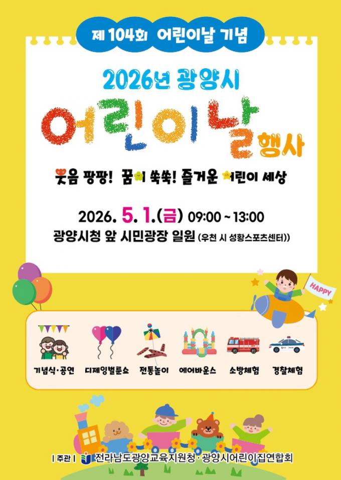 [È£³²´º½º¶óÀÎ = ¼ÀºÈ« ±âÀÚ] ±¤¾ç½Ã´Â Á¦104ȸ ¾î¸°À̳¯À» ¸Â¾Æ ¿À´Â 5¿ù 1ÀÏ ±¤¾ç½Ãû ¾Õ ±¤¾ç½Ã¹Î±¤Àå ÀÏ¿ø¿¡¼ Àü¶ó³²µµ±¤¾ç±³À°Áö¿øÃ»°ú ±¤¾ç½Ã¾î¸°ÀÌÁý¿¬ÇÕȸ ÁÖ°üÀ¸·Î ¡®2026³â ±¤¾ç½Ã ¾î¸°À̳¯ Çà»ç¡¯¸¦ ¿¬´Ù°í ¹àÇû´Ù.