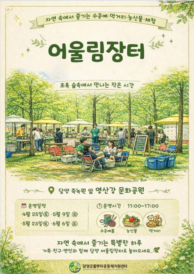 [È£³²´º½º¶óÀÎ = ¼ÀºÈ« ±âÀÚ] ´ã¾ç±º Ç®»Ñ¸®°øµ¿Ã¼Áö¿ø¼¾ÅͰ¡ Áö¿ª °øµ¿Ã¼¿Í ¼Ò»ó°øÀÎÀÇ »ó»ýÀ» µ½°í Áö¿ª °æÁ¦¸¦ »ì¸®±â À§ÇÑ ¡®2026³â ¾î¿ï¸²ÀåÅÍ¡¯¸¦ ¿À´Â 6¿ù±îÁö ÃÑ 4ȸ ¿î¿µÇÑ´Ù.