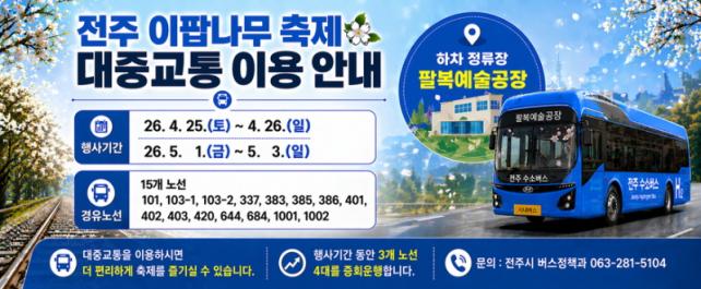 ÀüÁֽô ¿À´Â 25ÀÏ~26ÀÏ, 5¿ù 1ÀÏ~3ÀÏ µî ÃÑ 5Àϰ£ ÆÈº¹¿¹¼ú°øÀå ÀÏ´ë¿¡¼ ÆîÃÄÁö´Â ¡®2026 ÀüÁÖ ÀÌÆË³ª¹« ÃàÁ¦¡¯¿¡ ¸ÂÃç ¹æ¹®°´ ÁýÁß ½Ã±â¿¡ ½Ã³»¹ö½º ¿îÇàÀ» Á¶Á¤ÇÏ´Â µî ±³Åë¼ö¿ä Áß½ÉÀÇ ¿î¿µ ´ëÃ¥À» ÃßÁøÇÑ´Ù°í 23ÀÏ ¹àÇû´Ù.