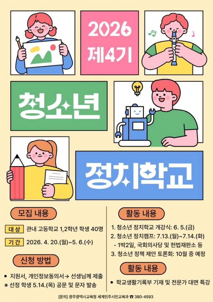 [È£³²´º½º¶óÀÎ = ¼ÀºÈ« ±âÀÚ] ±¤Áֽñ³À°Ã»Àº û¼Ò³âÀÇ Á¤Ä¡Âü¿© ¿ª·®À» Ű¿ì±â À§ÇØ ¡®Á¦4±â û¼Ò³â Á¤Ä¡Çб³¡¯ Âü°¡ÀÚ¸¦ ¸ðÁýÇÑ´Ù.