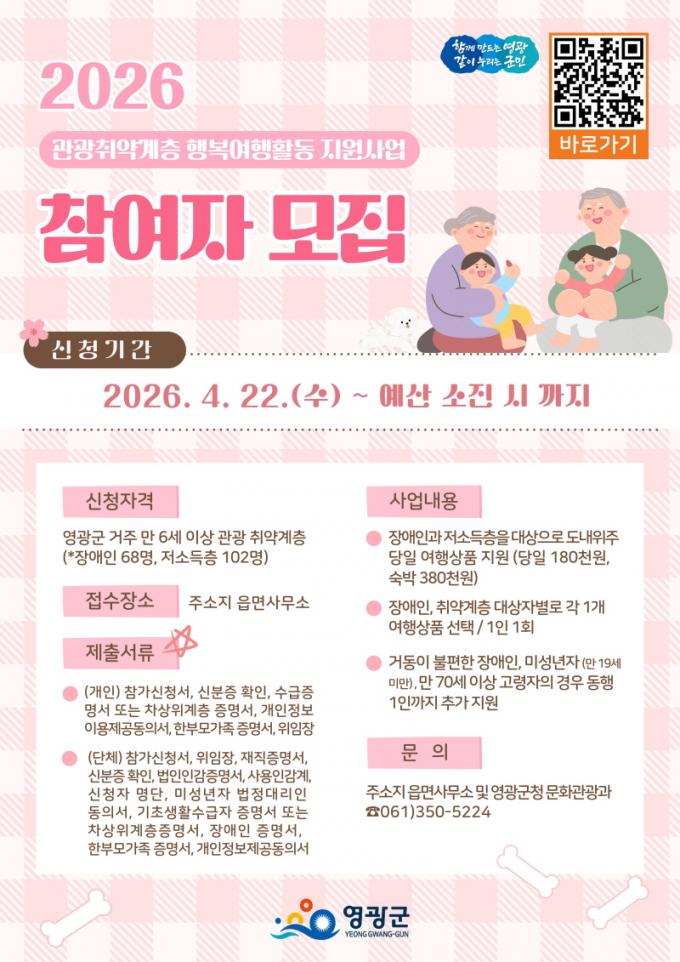 [È£³²´º½º¶óÀÎ = ¼ÀºÈ« ±âÀÚ] ¿µ±¤±º(¿µ±¤±º¼ö ±ÇÇÑ´ëÇà ºÎ±º¼ö ¼Û±¤¹Î)Àº Áö³ 4¿ù 22ÀϺÎÅÍ °ü±¤È°µ¿ ¿¡¼ ¼Ò¿ÜµÇ±â ½¬¿î °ü±¤Ãë¾à°èÃþÀÇ ±âº»±Ç º¸ÀåÀ» À§ÇØ¡®2026³â °ü±¤ Ãë¾à°èÃþ Çູ¿©ÇàȰµ¿ Áö¿ø»ç¾÷¡¯Âü°¡ÀÚ¸¦ ¸ðÁýÇϰí ÀÖ´Ù°í ¹àÇû´Ù.