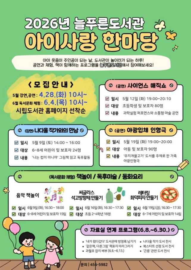 5¿ù¿¡´Â ¾î¸°À̵éÀÇ »ó»ó·Â°ú È£±â½ÉÀ» ÀÚ±ØÇÏ´Â ÇÁ·Î±×·¥ÀÌ ¸¶·ÃµÈ´Ù. ¡ã9ÀÏ¿¡´Â ¡®³ª´Â ÄÅÀÌ ¾Æ´Ï¾ß¡¯ÀÇ ÀúÀÚ ³ª´Ù¿ï ÀÛ°¡ ÃÊû °¿¬ÀÌ ÁøÇàµÇ¸ç, ¡ã12ÀÏ¿¡´Â °úÇÐ ¿ø¸®¸¦ ¸¶¼ú·Î Ç®¾î³½ ¡®»çÀ̾𽺠¸ÅÁ÷¼î¡¯°¡ ¿¸°´Ù. ÀÌ¾î ¡ã19ÀÏ¿¡´Â ¡®¹«Áö°³ ¹°°í±â¡¯¸¦ ÁÖÁ¦·Î ÇÑ ¡®¾ß±¤ ÀÔü ÀÎÇü±Ø¡¯ÀÌ °ü°´À» ¸¸³´Ù.