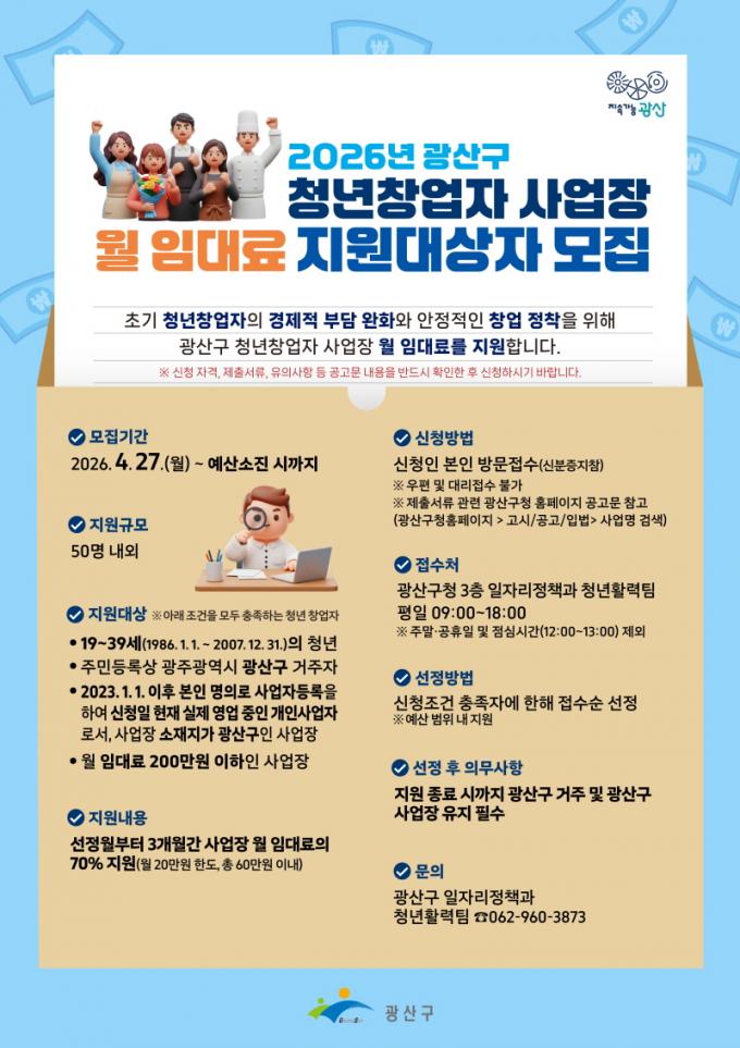 [È£³²´º½º¶óÀÎ = ¼ÀºÈ« ±âÀÚ] ±¤ÁÖ ±¤»ê±¸°¡ â¾÷ÇÑ Ã»³âÀÇ °æÁ¦Àû ºÎ´ãÀ» ´ú°í, ¾ÈÁ¤Àû Á¤ÂøÀ» µ½´Â ¡®2026³â ±¤»ê±¸ û³â â¾÷ÀÚ »ç¾÷Àå ¿ù ÀÓ´ë·á Áö¿ø»ç¾÷¡¯À» ÃßÁøÇÑ´Ù.