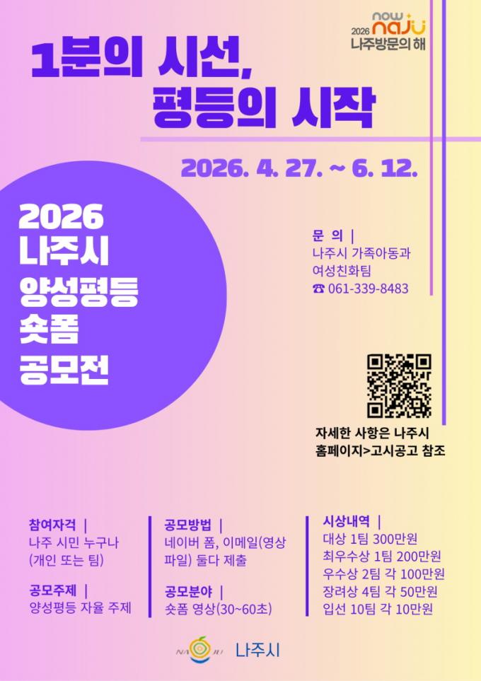 ³ªÁֽô ¡®2026³â ³ªÁֽà ¾ç¼ºÆòµî ¼ôÆû ¿µ»ó °ø¸ðÀü¡¯À» ÃßÁøÇÑ´Ù°í 28ÀÏ ¹àÇû´Ù. À̹ø °ø¸ðÀüÀº ¡®1ºÐÀÇ ½Ã¼±, ÆòµîÀÇ ½ÃÀÛ¡¯À» ÁÖÁ¦·Î ÀÏ»ó»ýȰ ¼Ó ¾ç¼ºÆòµîÀ» ¼ÒÀç·Î ÇÑ Ã¢ÀÇÀûÀÎ ¿µ»ó ÄÜÅÙÃ÷¸¦ ¹ß±¼Çϱâ À§ÇØ ¸¶·ÃµÆ´Ù.