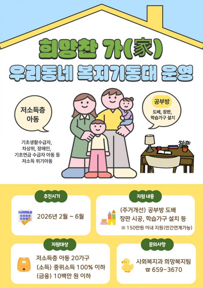 [È£³²´º½º¶óÀÎ = À̺´¸¸ ±âÀÚ] ¿©¼ö½Ã(½ÃÀå Á¤±â¸í)´Â Àú¼ÒµæÃþ ¾Æµ¿ÀÇ ÇнÀ ¿©°Ç °³¼±°ú ¾ÈÀüÇÑ ÁְŰø°£ Á¶¼ºÀ» À§ÇØ 2026³â ÁÖ°Åȯ°æ °³¼±»ç¾÷ ¡®Èñ¸ÁÂù °¡(Ê«)¡¯¸¦ ÃßÁøÇÑ´Ù°í ¹àÇû´Ù.