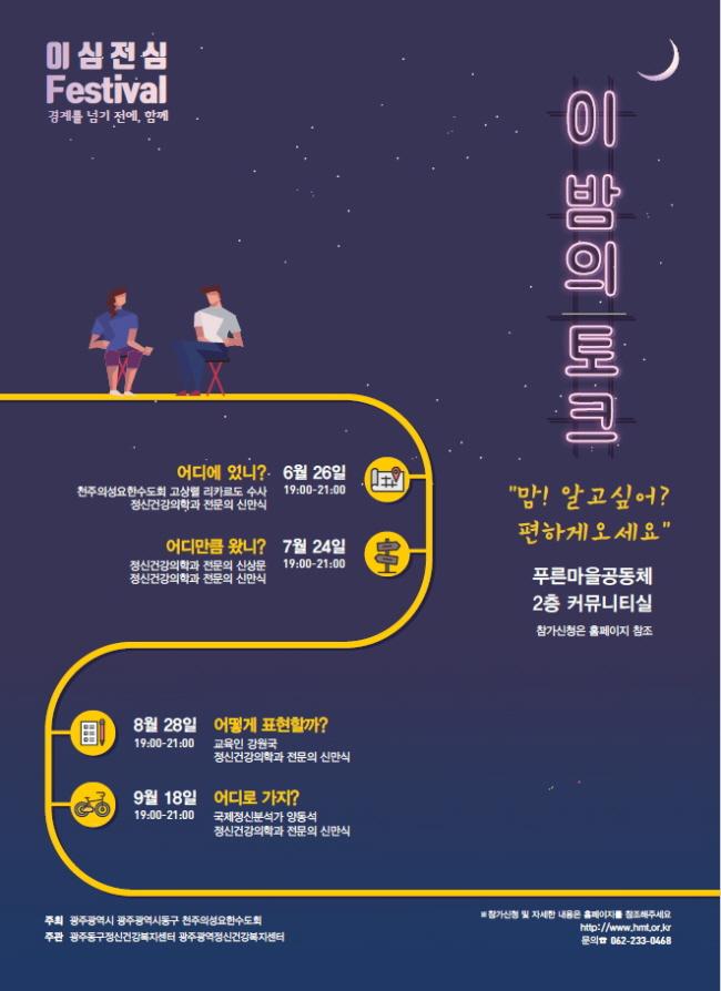 ±¤Áֽà µ¿±¸(ûÀå ÀÓÅÃ)°¡ Ǫ¸¥¸¶À»°øµ¿Ã¼¼¾ÅÍ¿¡¼ ¿À´Â 26ÀϺÎÅÍ 9¿ù±îÁö ¸Å¿ù ³Ý° ÁÖ ¼ö¿äÀÏ Àú³á 7½ÃºÎÅÍ Á¤½Å°Ç°ÅäÅ©¼î ¡®ÀÌ ¹ãÀÇ ÅäÅ©¡¯ ¸¦ °³ÃÖÇÑ´Ù°í ¹àÇû´Ù.