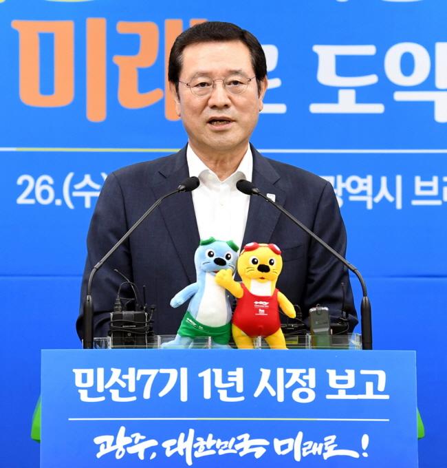 ÀÌ ½ÃÀåÀº ¡°±× °á°ú 1³â µ¿¾È¿¡ ±Ëµµ¸¦ ÀÌÅ»ÇÑ ±¤ÁÖ½ÃÁ¤À» Á¤»ó±Ëµµ·Î ¾ÈÂø½ÃÄ×°í, ±æ°Ô´Â ¼ö½Ê³â ª°Ô´Â ¼ö³â µ¿¾È ÇØ°áµÇÁö ¸øÇÑ ÇØ¹¬Àº °úÁ¦µéÀ» ¼Ó¼Ó ÇØ°áÇÏ´Â ¼º°ú¸¦ °ÅµÎ¾úÀ¸¸ç »ê¾÷ºÒ¸ðÁö ±¤ÁÖ¸¦ 4Â÷ »ê¾÷Çõ¸íÀÇ ¼±µµµµ½Ã·Î Å»¹Ù²Þ ½ÃÄ×´Ù¡±°í Æò°¡ÇßÀ¸¸ç, ´õºÒ¾î¡°±¤ÁֽùÎÀÇ ½Å·Ú ¼Ó¿¡ Çõ½ÅÀ¸·Î ÀÌ·ï³½ 6´ë ºÐ¾ß 100´ë ¼º°ú¸¦ ¹ÙÅÁÀ¸·Î ¾ÕÀ¸·Î ³²Àº 3³â. 10´ë ÇÙ½ÉÁ¤Ã¥À» º»°ÝÀûÀ¸·Î ÃßÁøÇØ ±¤ÁÖ¸¦ ´ëÇѹα¹ÀÇ ¹Ì·¡·Î ¿ì¶Ò ¼¼¿ì°Ú´Ù¡±°í µ¡ºÙ¿´´Ù.