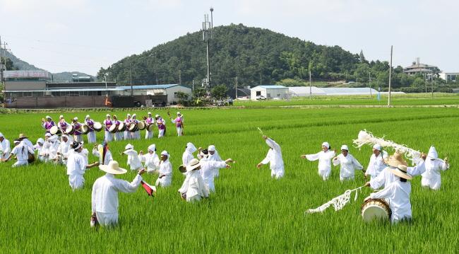 ÀÌÈÄ,¡®³óÀÚõÇÏÁö´ëº»(ÒÜíºô¸ù»ñýÓÞÜâ)¡¯ÀÌ »õ°ÜÁø ³ó±â¿Í ¸¸µå¸®±â¸¦ ¾Õ¼¼¿î ÀÏ²Û µî 100¿©¸íÀÇ ÀçÇöÆÀµéÀÌ ³íÀ¸·Î À̵¿ÇØ ¼Ò¸®²ÛµéÀÇ ¼Ò¸®¿Í ÇÔ²² ±è¸Å±â¸¦ ½Ç½ÃÇÑ´Ù. ±è¸Å±â¸¦ ¸¶Ä£ ¸Ó½¿µéÀº Ȳ¼Ò¸¦ Ÿ°í µé³ë·¡¸¦ ºÎ¸£¸ç ¸¶À»·Î µé¾î¿À°í, ¼´ë¼® ¼±¸Ã»ÀåÀº ³óÁÖ°¡ µÇ¾î ¸Ó½¿¿¡°Ô ¼ú°ú À½½ÄÀ» ±ÇÇÏ¸ç °Ý·ÁÇÑ´Ù.