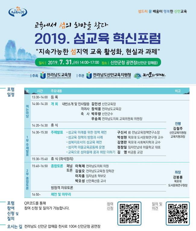 Àü¶ó³²µµ±³À°Ã»ÀÌ ÁÖÃÖÇϰí, ½Å¾È±³À°Áö¿øÃ»°ú ¸ñÆ÷´ëÇб³ µµ¼¹®È¿¬±¸¿øÀÌ °øµ¿ÁÖ°üÇϸç, ½Å¾È±ºÃ»ÀÌ ÈÄ¿øÇÏ´Â ¡®¼¶±³À° Çõ½ÅÆ÷·³¡¯ÀÌ 7¿ù 31ÀÏ ¿ÀÈÄ 2½Ã ½Å¾È±ºÃ» °ø¿¬Àå¿¡¼ ¿¸°´Ù. Áö¼Ó°¡´ÉÇÑ ¼¶Áö¿ª ±³À° Ȱ¼ºÈ, Çö½Ç°ú °úÁ¦¡¯¶ó´Â ÁÖÁ¦ÀÇ À̹ø Æ÷·³Àº 1ºÎ ÁÖÁ¦¹ßÇ¥¿Í 2ºÎ Á¾ÇÕÅä·ÐÀ¸·Î ÁøÇàµÈ´Ù.