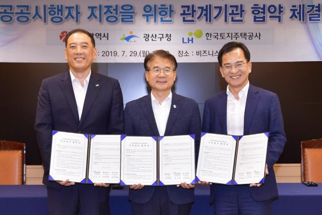 [È£³²´º½º¶óÀÎ = ¼ÀºÈ« ±âÀÚ] ±¤ÁÖ±¤¿ª½Ã´Â 29ÀÏ ¿ÀÈÄ ½Ãû ºñÁî´Ï½º·ë¿¡¼ Á¤Á¾Á¦ ÇàÁ¤ºÎ½ÃÀå°ú ±è»ïÈ£ ±¤»ê±¸Ã»Àå, ¹éÀÎö Çѱ¹ÅäÁöÁÖÅðø»ç(LH) ±¤ÁÖ¡¤Àü³²Áö¿ªº»ºÎÀåÀÌ Âü¼®ÇÑ °¡¿îµ¥ ±¤»ê±¸, Çѱ¹ÅäÁöÁÖÅðø»ç(LH)¿Í ¡®°ø°ø½ÃÇàÀÚ ÁöÁ¤Á¦ µµÀÔÀ» À§ÇÑ ¾÷¹«Çù¾à¡¯À» ü°áÇß´Ù.