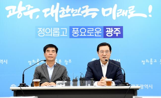 À̿뼷 ±¤ÁÖ½ÃÀå°ú À±Á¾ÇØ ÀÇÀåÀº 25ÀÏ ±¤ÁÖ½Ãû ºê¸®Çη뿡¼ °øµ¿±âÀÚ°£´ãȸ¸¦ °®°í ¡°ÀϺΠ¾ð·Ð¿¡¼ ¡®³ëÁ¶ ¸ù´Ï¿¡-»ç¾÷ÁÂÃÊ Çö½ÇÈ ¿ì·Á¡¯ µî »ç½ÇÀÌ ¾Æ´Ñ ³»¿ëµéÀÌ º¸µµµÇ¸é¼ ÅõÀÚ°¡µé¿¡°Ô ºÒÇÊ¿äÇÑ ºÒ¾È°¨À» Á¶¼ºÇϰí ÅõÀÚȯ°æÀ» ÀúÇØÇϰí ÀÖ¾î ¾ÈŸ±õ´Ù¡±¸ç ¡°»ç½Ç°ü°è¸¦ ºÐ¸íÇÏ°Ô ¸»¾¸µå¸®±â À§ÇØ °øµ¿±âÀÚ°£´ãȸ¸¦ °®°Ô µÆ´Ù¡±°í ¹àÇû´Ù.