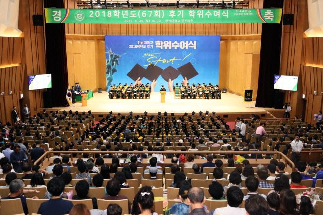 [È£³²´º½º¶óÀÎ = ¼ÀºÈ« ±âÀÚ] Àü³²´ëÇб³°¡ 8¿ù 26ÀÏ ¿ÀÀü ±³³» ¹ÎÁÖ¸¶·ç(´ë°´ç)¿¡¼ 2018Çг⵵ ÈıâÇÐÀ§¼ö¿©½ÄÀ» °®°í Çлç 1,240¸í, ¼®»ç 295¸í, ¹Ú»ç 117¸í, ¸í¿¹¹Ú»ç 1¸í µî ¸ðµÎ 1,653¸íÀÇ Á¹¾÷»ý¿¡°Ô ÇÐÀ§¸¦ ¼ö¿©Çß´Ù.