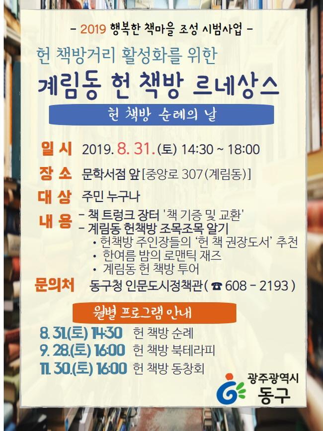 ±¤Áֽð¡ Áö¿øÇÏ´Â ¡®2019 ÇູÇÑ Ã¥¸¶À» Á¶¼º»ç¾÷¡¯ÀÇ ÀÏȯÀ¸·Î ÃßÁøµÇ´Â À̹ø Çà»ç´Â ¡®°è¸²µ¿ ÇåÃ¥¹æ ¸£³×»ó½º¡¯ ¼¼ ¹øÂ° ÇÁ·Î±×·¥À¸·Î, ÇåÃ¥¹æµéÀÇ ¼û°ÜÁø À̾߱â¿Í ÁÖÀÎÀåµéÀÌ ÃßõÇÑ µµ¼µéÀ» ¸¸³¯ ¼ö ÀÖ´Ù.