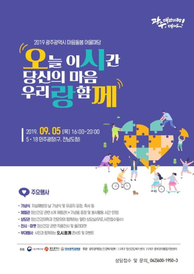 [È£³²´º½º¶óÀÎ = ¼ÀºÈ« ±âÀÚ] ±¤ÁÖ±¤¿ª½Ã´Â ¼¼°è Àڻ쿹¹æÀÇ ³¯(9¿ù10ÀÏ)°ú Á¤½Å°Ç°ÀÇ ³¯(10¿ù10ÀÏ)À» ¸Â¾Æ ¿À´Â 5ÀÏ 5․18¹ÎÁÖ±¤Àå¿¡¼ ¡®2019 ¸¶À½µ¹º½ ¾î¿ï¸¶´ç-¿À.½Ã.¶û.²²¡¯ Çà»ç¸¦ °³ÃÖÇÑ´Ù.