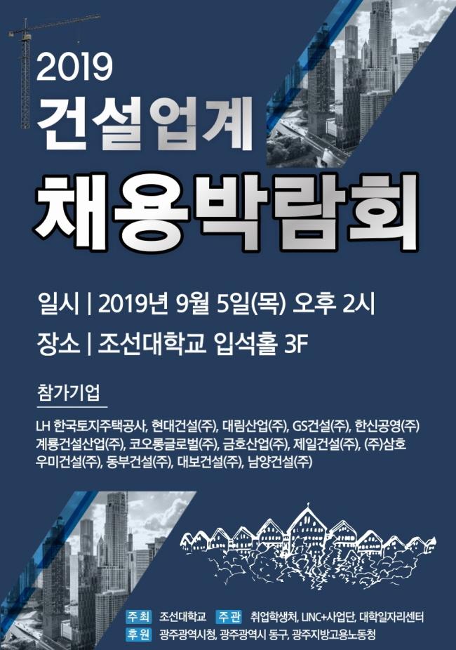 3ÀÏ Á¶¼±´ë¿¡ µû¸£¸é °Ç¼³¾÷°è ä¿ë¹Ú¶÷ȸ´Â 9¿ù 5ÀÏ(¸ñ) ¿ÀÀü 2½ÃºÎÅÍ 5½Ã±îÁö Á¶¼±´ëÇб³ °ø°ú´ëÇÐ ÀÔ¼®È¦¿¡¼ ¿¸°´Ù. À̹ø ¹Ú¶÷ȸ´Â Á¶¼±´ëÇб³°¡ ÁÖÃÖÇϰí Á¶¼±´ëÇб³ Ãë¾÷Çлýó¿Í Á¶¼±´ëÇб³ LINC+»ç¾÷´Ü, ´ëÇÐÀÏÀÚ¸®¼¾ÅͰ¡ ÁÖ°üÇÏ¸ç ±¤ÁÖ±¤¿ª½Ã, ±¤Áֽà µ¿±¸, ±¤ÁÖÁö¹æ°í¿ë³ëµ¿Ã»ÀÌ ÈÄ¿øÇÑ´Ù.