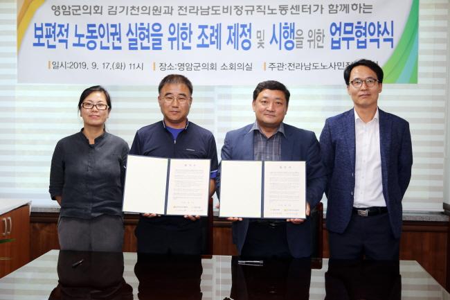 [È£³²´º½º¶óÀÎ = ±è°æÀÚ ±âÀÚ] Àü¶ó³²µµºñÁ¤±ÔÁ÷³ëµ¿¼¾ÅÍ¿Í ¿µ¾Ï±ºÀÇȸ ±è±âõ ÀÇ¿øÀº Áö³ 9¿ù 17ÀÏ ¿µ¾Ï±ºÀÇȸ ÀÇ¿ø½Ç¿¡¼ º¸ÆíÀû ³ëµ¿À뱂 ½ÇÇöÀ» À§ÇÑ Á¶·ÊÀÇ Á¦Á¤ ¹× ½ÃÇàÀ» À§ÇØ Çù¾àÀ» ü°áÇÏ¿´´Ù.