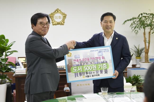 À̹ø °£´ãȸ¿¡¼ Áß±¸ÀÇȸ´Â ¾÷¹«Çù·Â ÀÇÁöÀÇ Ç¥ÇöÀ¸·Î ¼øÃµ½ÃÀÇȸ¿¡ µµ¼ 500±ÇÀ» ±âÁõÇØ µµ¼ ±âÁõ½ÄÀ» °¡Á³À¸¸ç, ¿¬³» ±âÁõŰ·Î Çß´Ù.