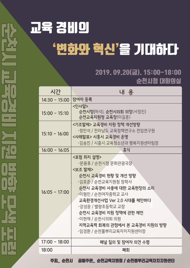 [È£³²´º½º¶óÀÎ = ±è°æÀÚ ±âÀÚ] ¼øÃµ½Ã¿¡¼´Â ¼øÃµ±³À°Áö¿øÃ», ¼øÃµÇ®»Ñ¸®±³À°ÀÚÄ¡Áö¿ø¼¾ÅÍ¿Í Áö³ 20ÀÏ(±Ý) ½Ãû ´ëȸÀǽǿ¡¼ ¡®±³À°°æºñ º¯È¿Í Çõ½ÅÀ» ±â´ëÇÏ´Ù¡¯¸¦ÁÖÁ¦·Î ±³À°°æºñÆ÷·³À» °³ÃÖÇß´Ù.