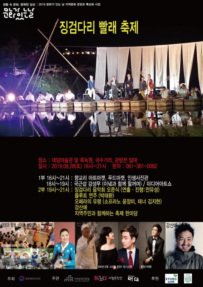 ¹Ì¼ú°ü¿¡¼´Â ±¹±Ù¼· ¾¾ÀÇ °¨¼º¹« °ø¿¬°ú Àλý»çÁø°üÀÌ ÁøÇàµÉ ¿¹Á¤ÀÌ°í °ü¹æÃµ ¡°Ë´Ù¸®¿¡¼´Â ¹Ìµð¾î ¾ÆÆ®¼î¿Í ¡°Ë´Ù¸® À½¾Çȸ°¡ ÁøÇàµÉ ¿¹Á¤ÀÌ´Ù. Áö¿ªÀÇ Æ¯»öÀ» Ȱ¿ëÇÏ¿© ÀÌ·ç¾îÁö´Â ¹Ìµð¾î ¾ÆÆ® ¼î¿¡¼´Â ´ë´ã¹Ì¼ú°ü°ú ´ã¾ç±º ¼Ò°³ µî Áö¿ªÀÇ À̾߱⸦ È®ÀÎÇÒ ¼ö ÀÖ°í À̾îÁö´Â ¡°Ë´Ù¸® À½¾Çȸ¿¡¼´Â °³±×¸Ç ÀüÀ¯¼ºÀÇ ÁøÇàÀ¸·Î ÇÃ·çÆ® ¿¬ÁÖ (¹ÚÅÂȯ), ¿ÀÆä¶óÀÇ À¯·É (¼ÒÇÁ¶ó³ë À±Àå¹Ì, Å×³Ê ±èÁöÇö), °»ê¿¡ÀÇ °ø¿¬°ú Áֹΰú ÇÔ²²ÇÏ´Â ÃàÁ¦ ÇѸ¶´ç ±ÇÇϰæ, ±¹±Ù¼·, dz·Â¹ßÀü¼Ò °¡¶ôÁö »ç¹°³îÀÌ, ¹Ú¾ç±âÃÌÀå´Ô, °ü¶÷°´, °ü±¤°´, ¹®È¿¹¼úÀ» »ç¶ûÇÏ´Â »ç¶÷µéÀÇ ³îÀ̸¶´ç °ø¿¬ÀÌ ÆîÃÄÁø´Ù.