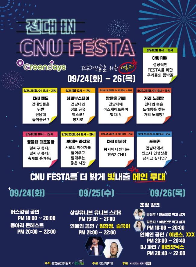 ¿ÃÇØ ÃàÁ¦´Â ¡®#Greendays_CNU FESTA¡¯·Î ¸í¸íÇØ º¸Á¶¿îµ¿Àå°ú ÈĹ®, ¿ëÁö, ºÀÁö ÀÏ´ë¿¡¼ ´Ù¾çÇÑ ÇÁ·Î±×·¥À¸·Î ÆîÃÄÁø´Ù. ÁÖ ¹«´ë°¡ ¼³Ä¡µÈ º¸Á¶¿îµ¿Àå¿¡´Â ¹Ì´Ï¹ÙÀÌÅ·, µð½ºÄÚ ÆÎÆÎ µî ³îÀ̱ⱸ°¡ µîÀåÇϰí, Á¦1Çлýȸ°ü¿¡µµ ¡®¹æÅ»Ã⡯, ¡®Ã߸®°ÔÀÓ ¹Ì½ºÅ׸® »ç°Ç¡¯ µîÀÌ ÁøÇàµÈ´Ù.