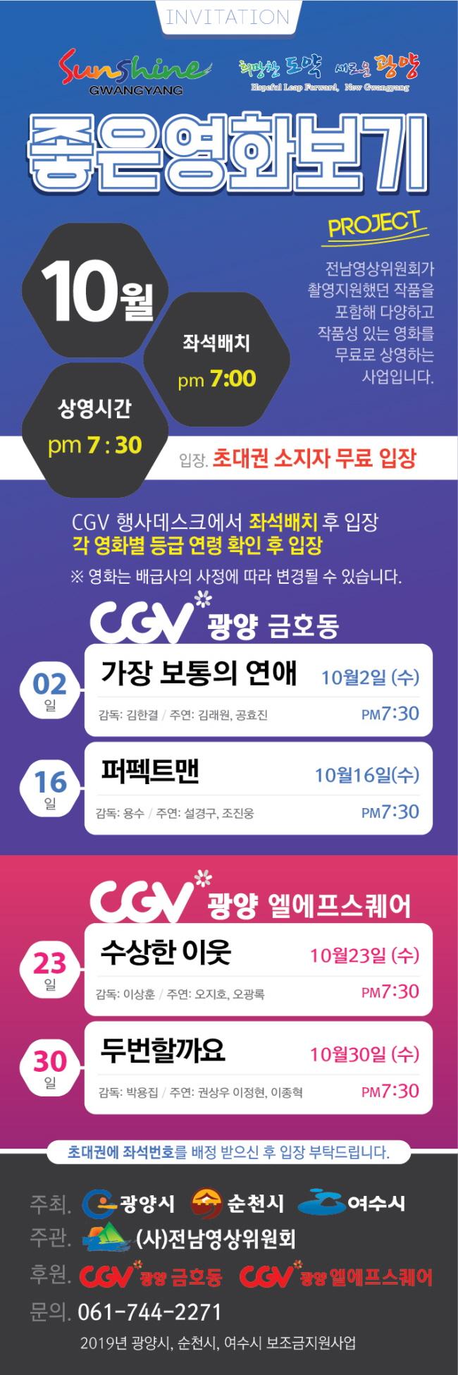 [È£³²´º½º¶óÀÎ = ±è°æÀÚ ±âÀÚ] ±¤¾ç½Ã´Â ½Ã ½Â°Ý 30Áֳ⠱â³äÇà»ç ÀÏȯÀ¸·Î ¿À´Â 10. 2.(¼ö)~29.(È) ¿ì¸® Áö¿ª¿¡¼ ÃÔ¿µµÇ¾ú°Å³ª ÀÛǰ¼º¿¡¼ ÁÁÀº Æò°¡¸¦ ¹Þ´Â °³ºÀ¿µÈ¸¦ ¹«·á·Î °ü¶÷ÇÒ ¼ö ÀÖ´Â 'ÁÁÀº ¿µÈº¸±â ÇÁ·ÎÁ§Æ®'°¡ ÁøÇàµÈ´Ù°í ¹àÇû´Ù.
