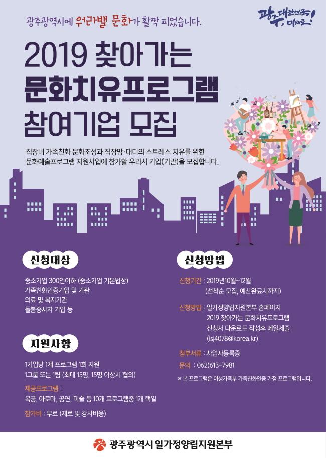 [È£³²´º½º¶óÀÎ = ¼ÀºÈ« ±âÀÚ] ±¤ÁÖ±¤¿ª½Ã Àϰ¡Á¤¾ç¸³Áö¿øº»ºÎ´Â ¡®2019 ã¾Æ°¡´Â ¹®ÈÄ¡À¯ÇÁ·Î±×·¥¡¯¿¡ Âü¿©ÇÒ Áß¼Ò±â¾÷°ú °¡Á·Ä£ÈÀÎÁõ±â¾÷ µî 10°÷À» ¸ðÁýÇÑ´Ù.