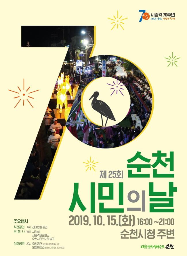 [È£³²´º½º¶óÀÎ = ¼ÀºÈ« ±âÀÚ] ¼øÃµ½Ã´Â¡®½Ã ½Â°Ý 70ÁÖ³â, »õ·Î¿î ¼øÃµ ÇູÇÑ µ¿Ç࡯À» ÁÖÁ¦·Î Á¦25ȸ ¼øÃµ½Ã¹ÎÀÇ ³¯ Çà»ç¸¦ ¿À´Â 10¿ù 15ÀÏ(È) ¿ÀÈÄ 3½ÃºÎÅÍ ½Ãû ÁÖº¯¿¡¼ °³ÃÖÇÑ´Ù°í ¹àÇû´Ù.