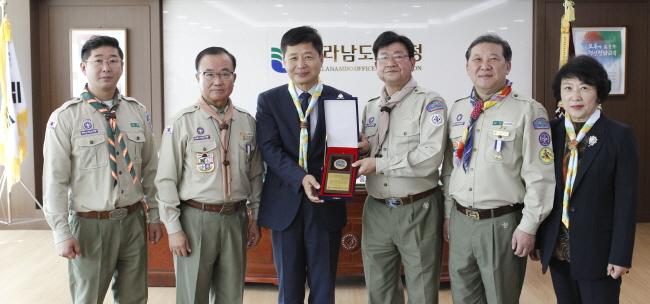 Çѱ¹½ºÄ«¿ìÆ®¿¬¸Í(ÃÑÀç ÀÓÁ¾ÇÑ) Àü³²¿¬¸Í °¿ø¹è ºÎ¿¬¸ÍÀå µî 5¸íÀÇ ÀÓ¿øµéÀº 16ÀÏ(¼ö) ¿ÀÀü Àü¶ó³²µµ±³À°Ã»À» ¹æ¹®, Àå¼®¿õ ±³À°°¨¿¡°Ô ¡®ÈÞÀü¼± 155¸¶ÀÏ È¾´Ü ÆòÈÅëÀÏüÇèȰµ¿¡¯ µî û¼Ò³âµéÀÇ ¼ö·ÃȰµ¿¿¡ ±â¿©ÇÑ °ø·Î·Î °¨»çÆÐ¸¦ Àü´ÞÇß´Ù.