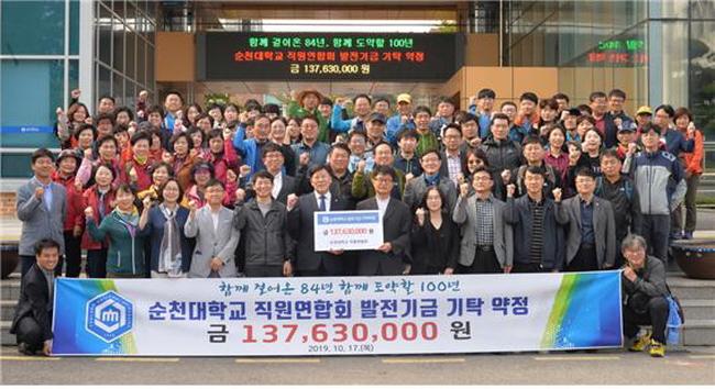 [È£³²´º½º¶óÀÎ = ¼ÀºÈ« ±âÀÚ] ¼øÃµ´ëÇб³(ÃÑÀå °í¿µÁø)´Â Á÷¿øµé·Î ±¸¼ºµÈ Á÷¿ø¿¬ÇÕȸ ȸ¿ø 210¸íÀÌ ´ëÇйßÀü±â±Ý 1¾ï 3õ7¹é6½Ê¿©¸¸ ¿øÀ» ±âŹÇϱâ·Î ¾àÁ¤Çß´Ù°í 17ÀÏ ¹àÇû´Ù.