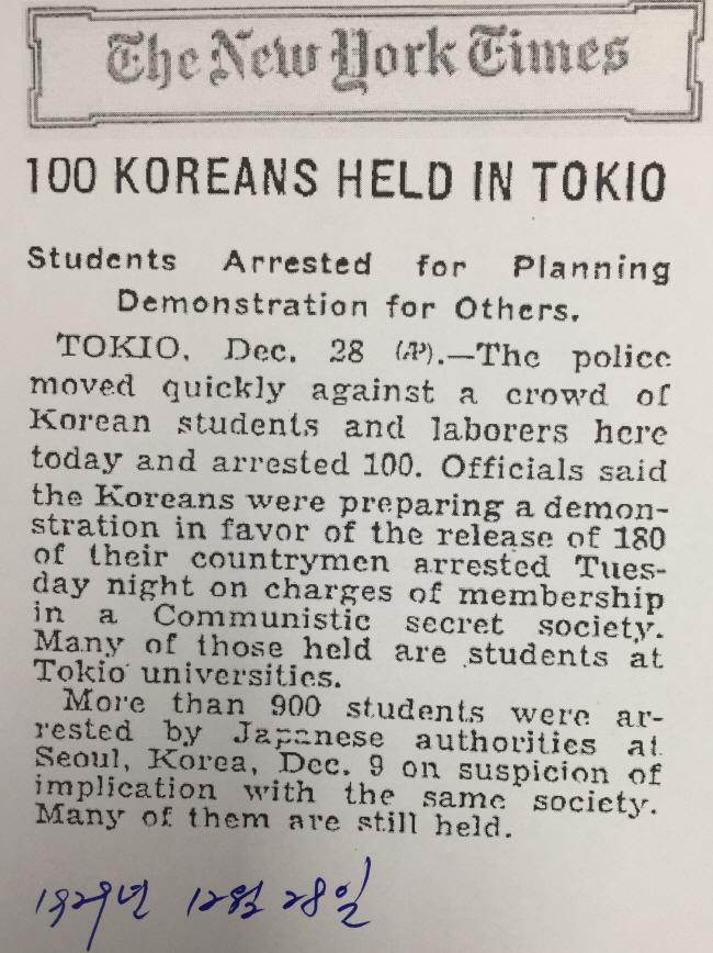 Àü³²´ëÇб³ ±èÀç±â ±³¼ö(Á¤Ä¡¿Ü±³Çаú)´Â 3³â°£ÀÇ ÃßÀû ³¡¿¡ Áö³ 7¿ù ¹Ì±¹ ´º¿å ¸ÇÇÏź¿¡ ÀÖ´Â ´º¿å°ø°øµµ¼°ü¿¡¼ 1929³â 12¿ù 26ÀÏÀÚ ¡®µ¿°æ°æÂû Çѱ¹Çлý 180¸í üÆ÷¡¯¶ó´Â Á¦¸ñÀÇ ±â»ç µî ¸ðµÎ 3°ÇÀ» ¹ß±¼ÇØ ±¤ÁÖÇлýµ¶¸³¿îµ¿ 90ÁÖ³âÀ» ¾ÕµÎ°í °ø°³Çß´Ù.