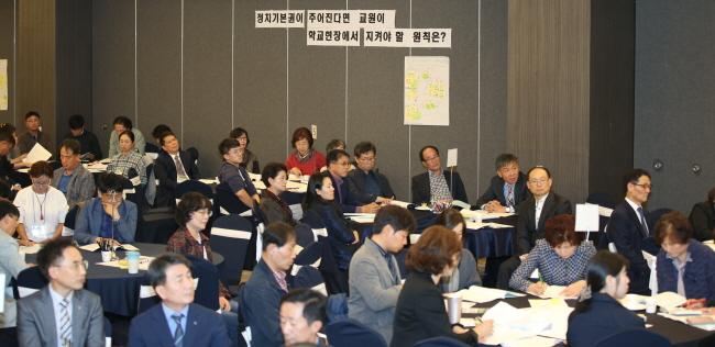 À̾î¼, Âü¼®ÀÚµéÀº ¡®±³¿ø Á¤Ä¡±âº»±ÇÀÌ º¸ÀåµÇ¸é Çб³ÇöÀå¿¡¼ ¾î¶² º¯È°¡ ¿¹»óµÇ´Â°¡?¡¯¶ó´Â ÁÖÁ¦·Î 1Â÷ Åä·ÐÀ» ÇÑ ÈÄ, ¡®Á¤Ä¡±âº»±ÇÀÌ ÁÖ¾îÁ³À» ¶§, Çб³ÇöÀå¿¡¼ ±³¿øÀÌ ÁöÄÑ¾ß ÇÒ ¿øÄ¢Àº?¡¯ À̶ó´Â ÁÖÁ¦·Î 2Â÷ Åä·ÐÀ» ÁøÇàÇß´Ù. À̵éÀº ¿øÅ¹ º°·Î ´Ù¾çÇÑ Åä·Ð µµ±¸¸¦ ÀÌ¿ëÇØ ÀǰßÀ» ³ª´©°í ¹ßÇ¥ÀÇ ½Ã°£À» °¡Á³À¸¸ç, ¸ð¹ÙÀÏ ÅõÇ¥¸¦ ÅëÇØ ÃÖÁ¾ ÀǰßÀ» ¸ð¾Æ ¡®±³¿øÀÇ Á¤Ä¡±âº»±Ç º¸ÀåÀ» À§ÇÑ Àü³² ¿øÅ¹Åä·Ðȸ ¼±¾ð¹®¡¯À» ¿Ï¼ºÇß´Ù.