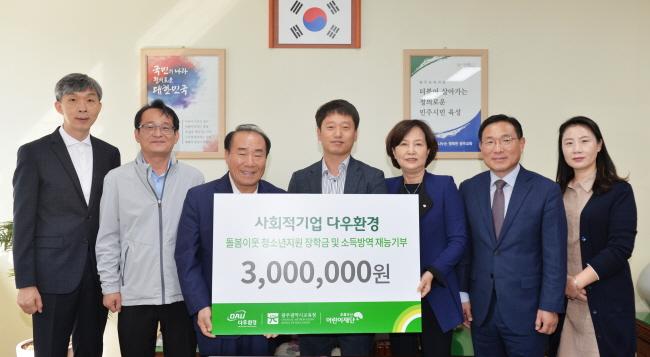 [È£³²´º½º¶óÀÎ = ¼ÀºÈ« ±âÀÚ] »çȸÀû±â¾÷ ´Ù¿ìȯ°æ(ÀÌÁ¤ÀÏ ´ëÇ¥ÀÌ»ç)Àº 21ÀÏ ±¤ÁÖ±¤¿ª½Ã±³À°Ã»(±³À°°¨ ÀåÈÖ±¹)À» ã¾Æ µ¹º½ÀÌ¿ô û¼Ò³âÀ» Áö¿øÇÏ´Â ÀåÇбÝ(3¹é¸¸¿ø)À» Àü´ÞÇϰí ÃÊ·Ï¿ì»ê ¾î¸°ÀÌÀç´Ü°ú ÇÔ²² ¾î·Á¿î ȯ°æÀÇ Ã»¼Ò³â °¡Á¤¿¡ ¼Òµ¶¡¤¹æ¿ª ¼ºñ½º¸¦ Á¦°øÇÏ´Â Àç´É±âºÎµµ ¾àÁ¤Çß´Ù.