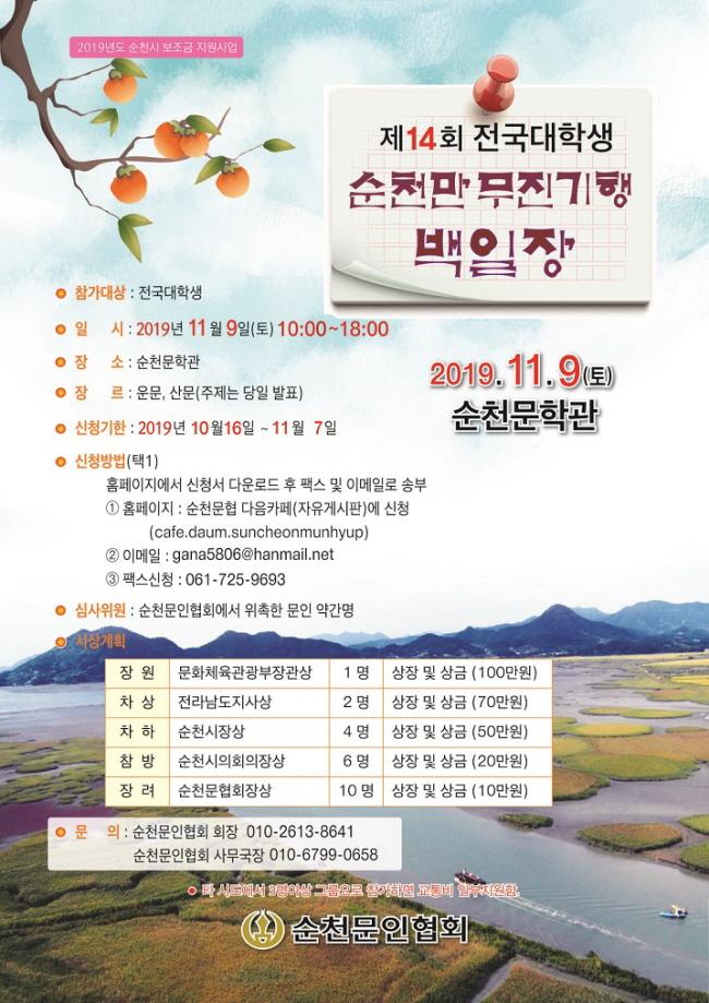 [È£³²´º½º¶óÀÎ = ¼ÀºÈ« ±âÀÚ] Çѱ¹¹®´Ü¿¡ °¨¼ö¼º Çõ¸íÀ» ÀÏÀ¸Å² ¼Ò¼³°¡ ±è½Â¿Á ¼±»ýÀÇ °íÇâÀÎ Àü³² ¼øÃµ¿¡¼ ¹«Áø±âÇàÀÇ ¹«´ëÀÎ ¼øÃµ¸¸À» ¹è°æÀ¸·Î ¡®Á¦14ȸ Àü±¹ ´ëÇлý ¼øÃµ¸¸ ¹«Áø±âÇà ¹éÀÏÀ塯ÀÌ °³ÃֵȴÙ.