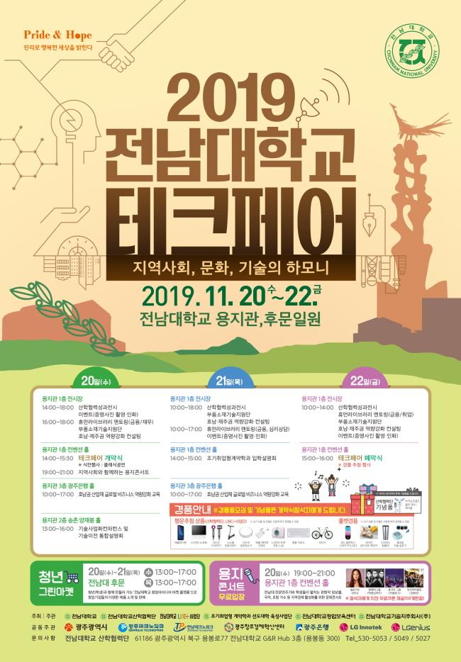 [È£³²´º½º¶óÀÎ = ¼ÀºÈ« ±âÀÚ] Àü³²´ëÇб³°¡ ¿À´Â 20ÀϺÎÅÍ 22ÀϱîÁö Çг» ¿ëÁö°ü°ú ÈĹ® ÀÏ´ë¿¡¼ ¡®Áö¿ª»çȸ, ¹®È, ±â¼úÀÇ Çϸð´Ï¡¯¸¦ ½½·Î°ÇÀ¸·Î ÇÑ ¡®2019 Àü³²´ëÇб³ Å×Å©Æä¾î¡¯¸¦ °³ÃÖÇÑ´Ù.