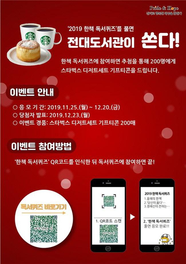 ÇÑ Ã¥ µ¶¼ÄûÁî´Â 2019 ¿Ã ÇØÀÇ ÇÑ Ã¥ ¡¸´ç½ÅÀÌ ¿Ç´Ù¡¹(Á¤Çý½Å ÀÛ)¸¦ Àаí ÁÖ¿ä Ű¿öµå¸¦ ¸ÂÃß´Â ¹®Á¦·Î ±¸¼ºµÅ ÀÖ´Ù. ±¤ÁÖ¡¤Àü³² ½Ãµµ¹Î ´©±¸³ª ȸéÀÇ QRÄڵ带 ½ºÄµÇϰųª ȨÆäÀÌÁö ¸µÅ©¸¦ ÅëÇØ Âü¿©ÇÒ ¼ö ÀÖ´Ù. 11¿ù 25ÀϺÎÅÍ 12¿ù 20ÀϱîÁö. Àü³²´ë´Â Ãß÷À» ÅëÇØ 200¸í¿¡°Ô Ä¿ÇÇ »óǰ±ÇÀ» ÁõÁ¤ÇÑ´Ù. ´ç÷ÀÚ´Â 12¿ù 23ÀÏ Àü³²´ëÇб³ µµ¼°ü ȨÆäÀÌÁö¿¡ °øÁöµÈ´Ù.