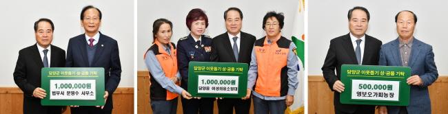 ´ã¾çÀ¾ ¿©¼ºÀÇ¿ë¼Ò¹æ´ë´Â ÀÚ¿¬Á¤ÈȰµ¿, Á¶¼Õ°¡Á¤µ½±â ¼±¹°²Ù·¯¹ÌÀü´Þ µî ²ÙÁØÇÑ ÀÌ¿ô»ç¶ûÀ» ½ÇõÇϰí ÀÖÀ¸¸ç, Áö³ 1¿ù ´ã¾çÀ¾»ç¹«¼Ò¿¡ 50¸¸ ¿øÀ» ±âŹÇÑ µ¥ ÀÌ¾î ¿¬¸» ºÒ¿ìÀÌ¿ôµ½±â ¼º±ÝÀ¸·Î 1¹é¸¸ ¿øÀ» ±âŹÇß´Ù.