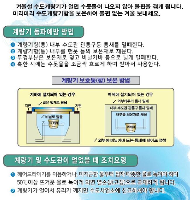 ¼öµµ°è·®±â µ¿ÆÄ ¿¹¹æÀ» À§Çؼ´Â º¸È£Åë³» Âù °ø±â°¡ À¯ÀÔµÇÁö ¾Êµµ·Ï ½ºÆ¼·Îǰ, Çå¿Ê, Çå ÀÌºÒ µî º¸¿Âµ¤°³·Î º¸È£ÇØ¾ß Çϰí, ¾ÆÆÄÆ® °è´Ü â¹®À» ´Ý¾Æ Âù¹Ù¶÷ À¯ÀÔÀ» Â÷´ÜÇÏ´Â º¸¿Â°ü¸®¿¡ ½Å°æÀ» ½á¾ß Çϸç, ¿µÇÏ 10µµ ÀÌÇÏÀÇ È¤ÇÑÀÌ °è¼ÓµÉ ¶§¿¡´Â °è·®±âÇÔ º¸¿Â Á¶Ä¡¿Í ´õºÒ¾î µ¿ÆÄ¿¹¹æÀ» À§ÇØ Àá½Ã ¿ÜÃâÇÒ ¶§³ª ¾ß°£¿¡ ¼öµ¾¹°À» »ç¿ëÇÏÁö ¾ÊÀ» ¶§ ¿åÁ¶³ª ¼¼¸é´ë, ½ÌÅ©´ëÀÇ ¼öµµ²ÀÁö¸¦ Á¶±Ý¾¿ Ʋ¾î ³õ¾Æ ¼öµ¾¹°À» Èê·Áº¸³»¾ß ÇÑ´Ù.