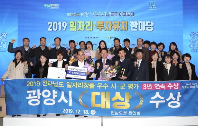 [È£³²´º½º¶óÀÎ = ¼ÀºÈ« ±âÀÚ] ±¤¾ç½Ã´Â 18ÀÏ(¼ö) Àü³²µµÃ» ¿ÕÀνǿ¡¼ ¿¸° ¡®Àü¶ó³²µµ ÀÏÀÚ¸®․ÅõÀÚÀ¯Ä¡ ÇѸ¶´ç¡¯ Çà»ç¿¡¼ 2019 Àü³² ÀÏÀÚ¸®Ã¢Ãâ Æò°¡ ¡®´ë»ó¡¯À» ¼ö»óÇÏ°í Æ÷»ó±Ý 3õ¸¸ ¿øÀ» ¹Þ¾Ò´Ù°í ¹àÇû´Ù.