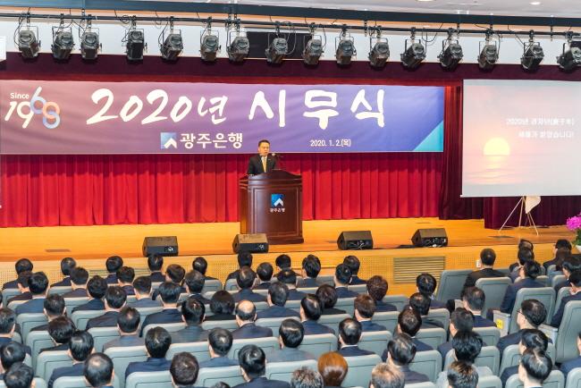 [È£³²´º½º¶óÀÎ = ¼ÀºÈ« ±âÀÚ] ±¤ÁÖÀºÇà(ÀºÇàÀå ¼ÛÁ¾¿í)Àº 2ÀÏ ±¤ÁÖÀºÇà º»Á¡ 3Ãþ ´ë°´ç¿¡¼ ¼ÛÁ¾¿í ÀºÇàÀå°ú ÀÓÁ÷¿ø µî 500¿©¸íÀÌ Âü¼®ÇÑ °¡¿îµ¥ 2020³â ½Ã¹«½ÄÀ» °³ÃÖÇß´Ù°í ¹àÇû´Ù.